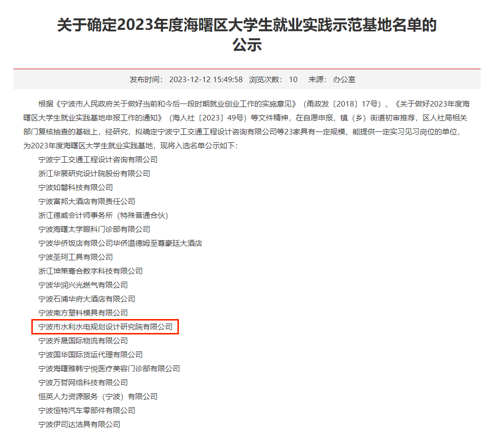 發(fā)布日期:2023.12.21 近日,根據(jù)《寧波市人民政府關(guān)于做好當(dāng)前和今后一段時(shí)期就業(yè)創(chuàng)業(yè)工作的實(shí)施意見》(甬政發(fā)〔2018〕17號)、《關(guān)于做好2023年度海曙區(qū)大學(xué)生就業(yè)實(shí)踐基地申報(bào)工作的通知》(海人社〔2023〕... -