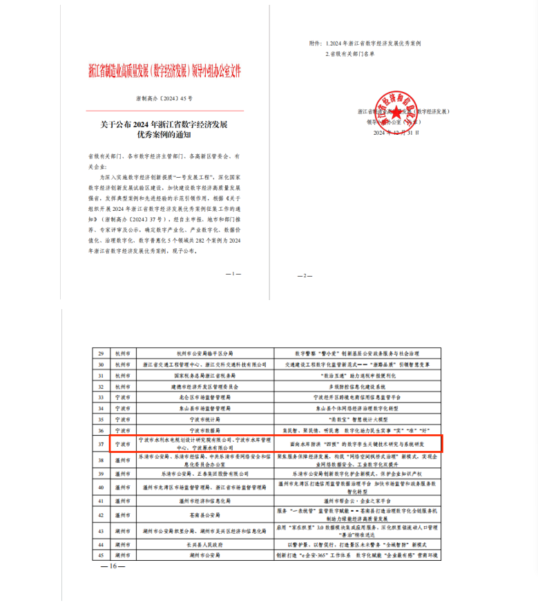 近日,浙江省經(jīng)濟(jì)和信息化廳發(fā)布《2024年浙江省數(shù)字經(jīng)濟(jì)優(yōu)秀案例擬確定名單》并完成公示,我院與寧波市水庫管理中心、寧波原水有限公司聯(lián)合申報的“面向水庫防洪‘四預(yù)’的數(shù)字孿生關(guān)鍵技術(shù)研究與系統(tǒng)研發(fā)”案例成功入選。