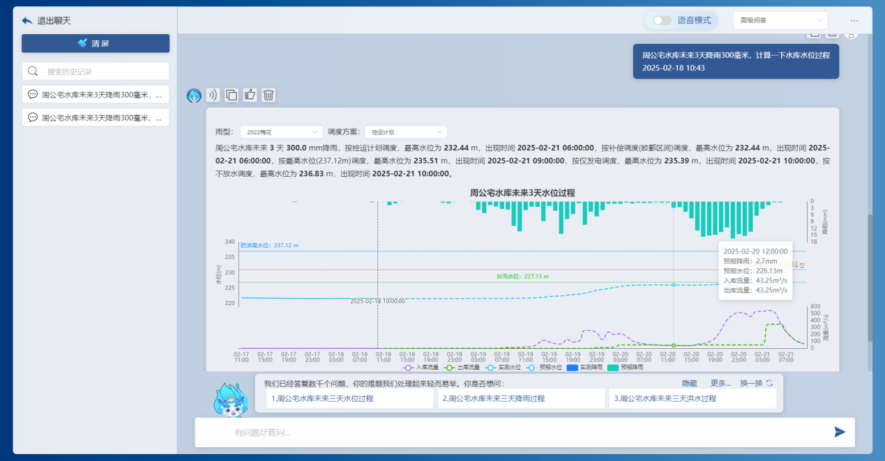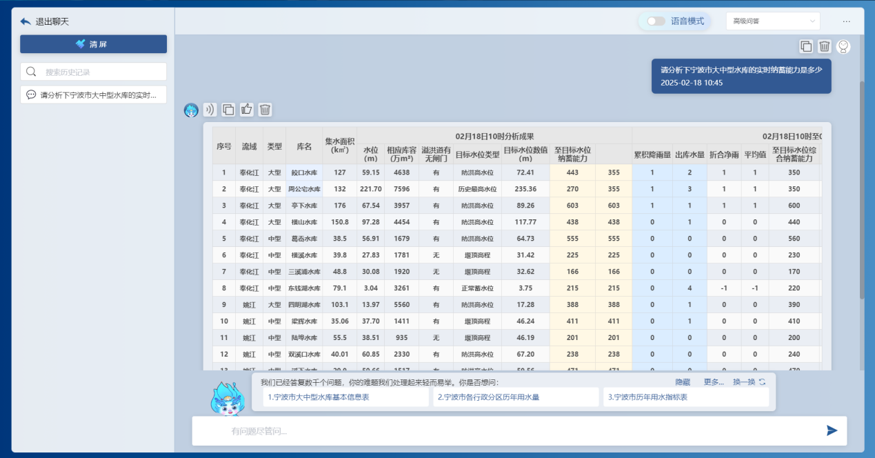 基于前端感知的降雨、水位、流量、工程運行等實時信息,借助DeepSeek大模型和“甬水院智算”算法庫,能夠?qū)崟r對流域防汛形勢進(jìn)行快速分析,包括降雨形勢、水情預(yù)警、預(yù)泄分析、水庫納蓄分析等,可以按照規(guī)定的表單形式一鍵輸出成果,為防汛防洪工作提供兼具前瞻性、科學(xué)性、精準(zhǔn)性、安全性的決策支撐。相關(guān)學(xué)術(shù)成果曾以《基于大模型的水利防汛智能問答關(guān)鍵技術(shù)研究與應(yīng)用探索》為題于去年8月的第七屆城市水安全與水管理學(xué)術(shù)交流會作專題匯報。