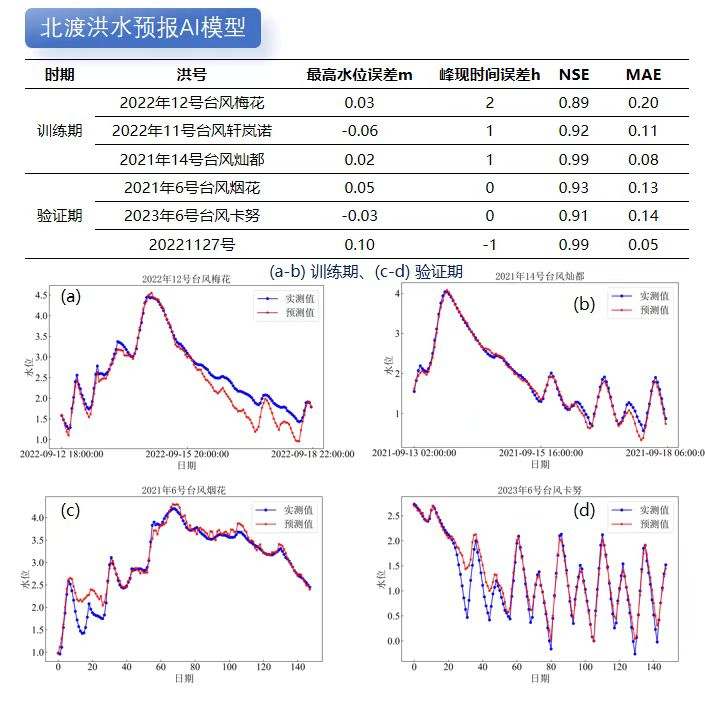 利用成熟水利專業(yè)模型模擬計算不同降雨潮位邊界條件下的洪水過程數(shù)據(jù),再基于DeepSeek對海量洪水模擬數(shù)據(jù)成果進(jìn)行模型訓(xùn)練和蒸餾。目前我院已對北渡、鎮(zhèn)海等重要流域控制站點進(jìn)行了AI洪水預(yù)報模型訓(xùn)練和精度驗證,結(jié)果表明AI洪水預(yù)報的準(zhǔn)確性不輸傳統(tǒng)水利專業(yè)模型。