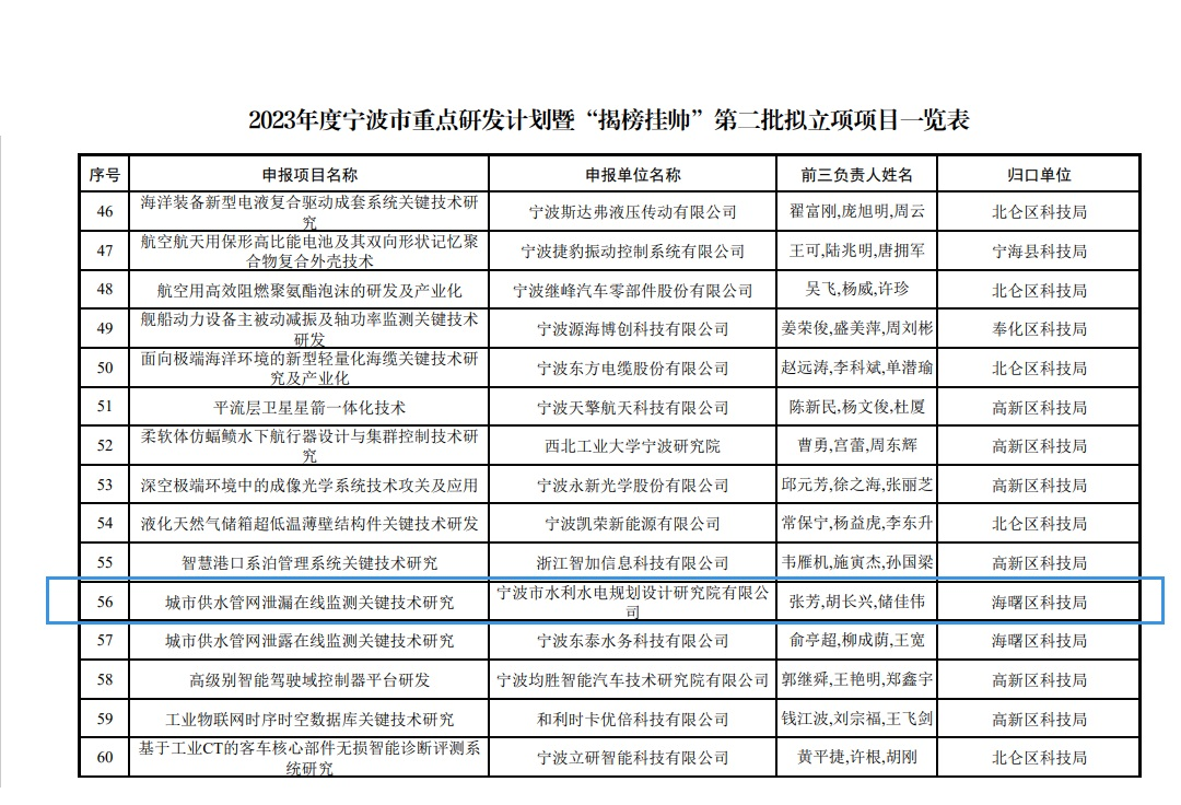 此前,我院“城市供水管網(wǎng)泄漏在線監(jiān)測(cè)關(guān)鍵技術(shù)研究”已入選寧波市重點(diǎn)研發(fā)計(jì)劃暨“揭榜掛帥”第二批擬立項(xiàng)項(xiàng)目。兩個(gè)項(xiàng)目合同總經(jīng)費(fèi)達(dá)4000萬元。