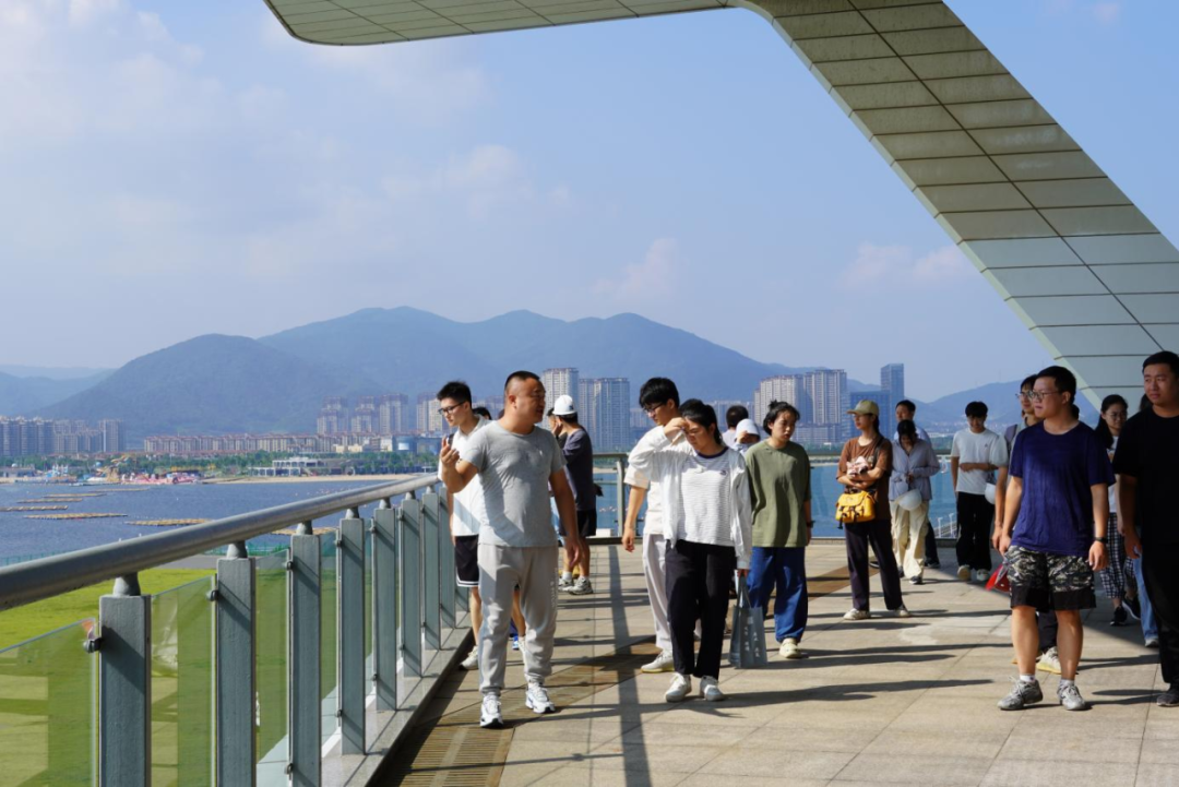 梅山灣外,銀浪拍岸;梅山灣內(nèi),碧波含翠。首先,研學(xué)隊(duì)伍到達(dá)梅山灣建設(shè)管理中心,跟隨工作人員登樓參觀,眺望南堤樞紐及附近設(shè)施,聆聽(tīng)工程總體建設(shè)情況,并觀看宣傳片,了解該工程的誕生始末。