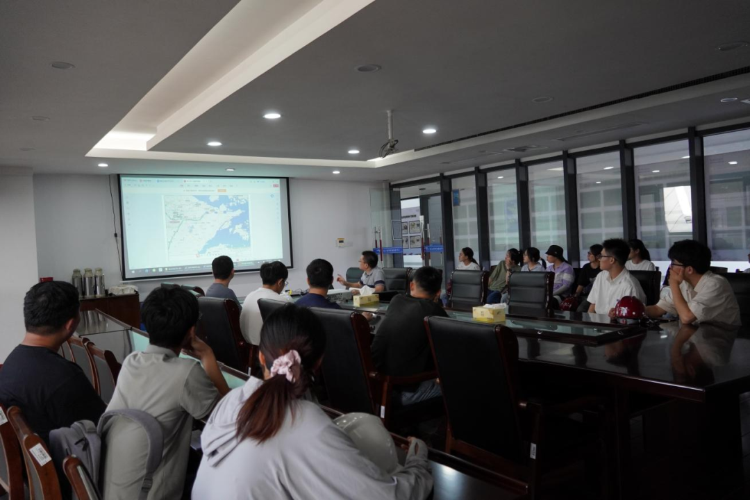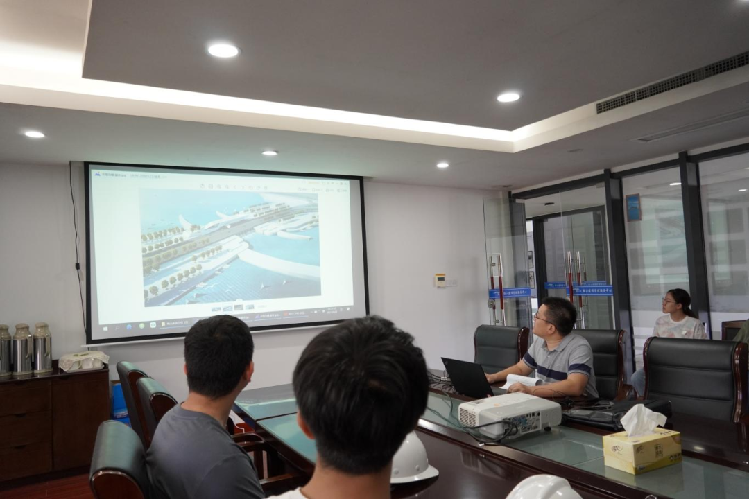 接著,研學(xué)隊(duì)伍來(lái)到會(huì)議室,胡經(jīng)理結(jié)合建設(shè)目標(biāo)、工程建設(shè)客觀因素、工程效益和景觀效果,詳細(xì)講解設(shè)計(jì)思路、問(wèn)題對(duì)策和創(chuàng)新點(diǎn),為大家上了一堂嚴(yán)謹(jǐn)生動(dòng)的復(fù)盤(pán)課。比如海堤采用緩坡入海,外側(cè)采用異形結(jié)構(gòu)塊消浪,內(nèi)坡采用生態(tài)水工磚美化,使海堤具備結(jié)構(gòu)和生態(tài)景觀雙重效果;船閘與海堤銜接段軟土處理采用新型技術(shù)應(yīng)用——樁網(wǎng)復(fù)合地基,形成“樁-網(wǎng)-土”協(xié)同工作共同承載的復(fù)合工藝。在座職工認(rèn)真聆聽(tīng)梅山灣如何從曾經(jīng)的“漲潮黃沙水,落潮滿(mǎn)目泥”到如今的“水清、岸綠、波寧、潮平”,受益匪淺。