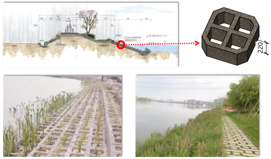 為了保證水體交換同時防御土體掏刷,工程迎水側護坡采用多孔混凝土生態(tài)護坡磚,不僅防沖固土,也利于水生動植物生長,營造自然、生態(tài)的水岸環(huán)境。